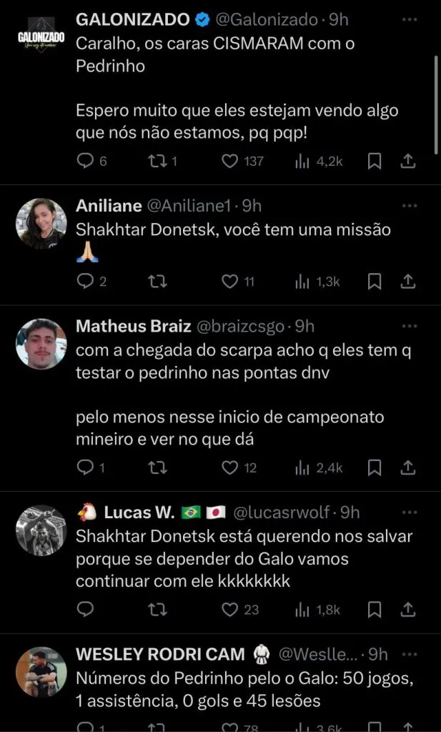 (SIC) “Números de Pedrinho pelo Galo: 50 jogos, 1 assistência, 0 gols e 45 lesões”; “Espero muito que eles estejam vendo algo que nós estamos”; “Tomara que o Galo não consiga comprar o Pedrinho”, foram alguns comentários.