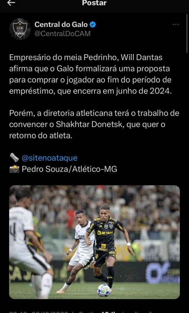 O Clube mineiro também busca solucionar aqueles que estão no elenco, é o exemplo de Pedrinho, que está emprestado ao Galo até julho de 2024. Foi informado pela Central do Galo, que o Corinthians estaria interessado no jogador.