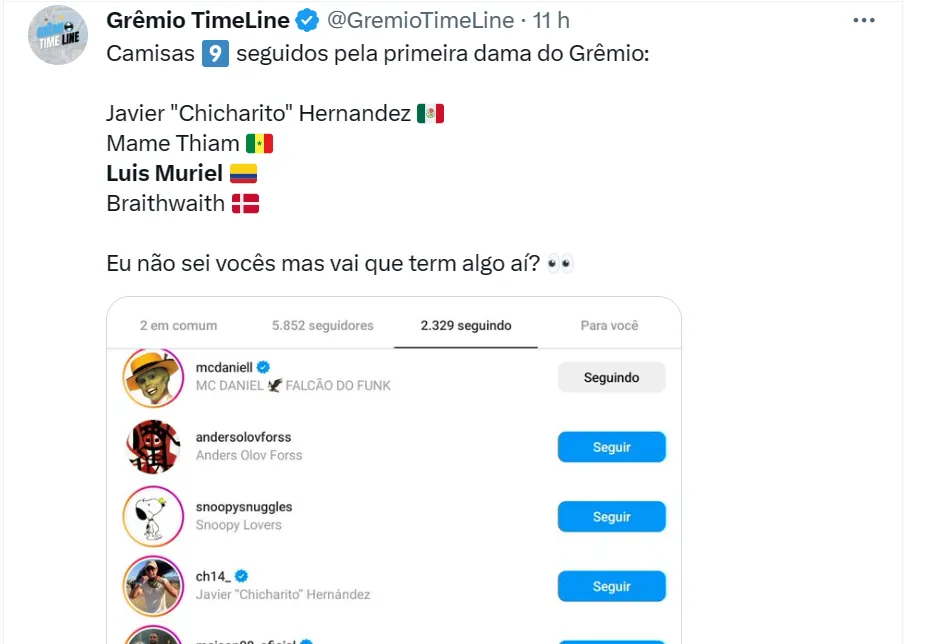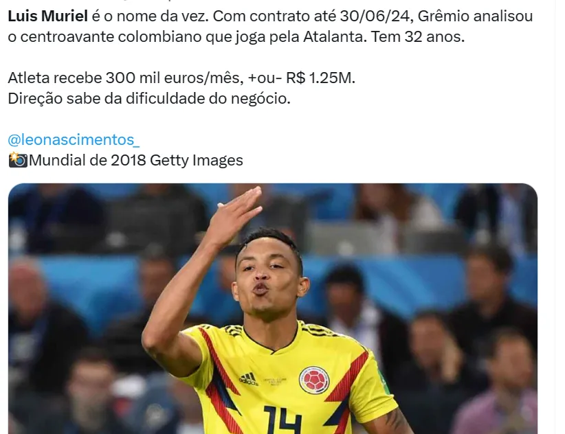 Hoje, de acordo com informações de Nascimento, Muriel recebe cerca de R$ 1,2 milhão por mês na Atalanta. O Grêmio estaria analisando a situação do colombiano para retornar ao continente em 2024.