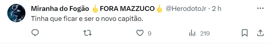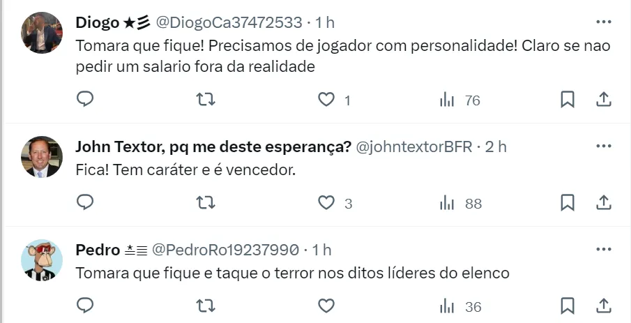 Nas redes sociais, os torcedores do Fogão desejam a renovação de Diego Costa e, alguns, segurem que ele seja o novo capitão do Alvinegro de General Severiano. Os botafoguenses acreditam que ele possa ser útil em 2024.