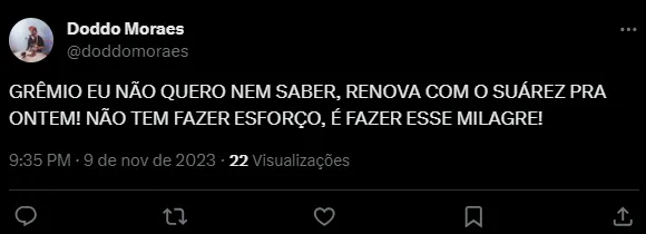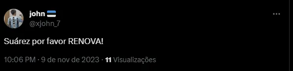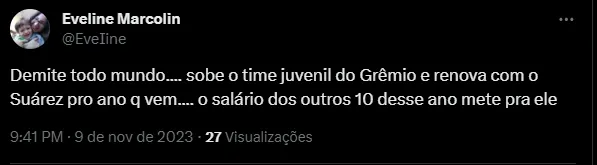 “Demite todo mundo…. sobe o time juvenil do Grêmio e renova com o Suárez pro ano que vem”, “Oferece R$ 3 milhões pra esse homem, que ele resolve” e “Grêmio, eu não quero nem saber, renova com o Suárez para ontem”, foram alguns comentários.