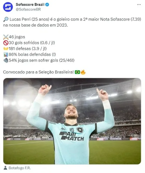 O Botafogo jogou contra o Defensa Y Justicia nesta quarta-feira (30), e se despediu da Copa Sul-Americana, após perder por 2 a 1. Apesar do revés, Lucas Perri foi notícia diante a sua grande temporada e recebeu a 2ª maior nota do Sofascore da base de dados do site, em 2023.