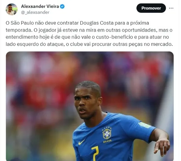 O São Paulo não vai contratar Douglas Costa na próxima janela de transferências. A visão da comissão técnica é de que não vale o custo-benefício do atleta de 33 anos.
