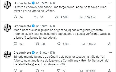 Pelo lado do Corinthians, o ex-jogador e apresentador Neto, que é marcado por opiniões fortes e por sempre se posicionar em diferentes assuntos. Em seu perfil oficial no X (antigo Twitter), ele começou afirmando que realmente foi pênalti para o Grêmio, mas destacou que antes do lance, a jogada já deveria ter sido parada por uma falta sofrida por Lucas Veríssimo.