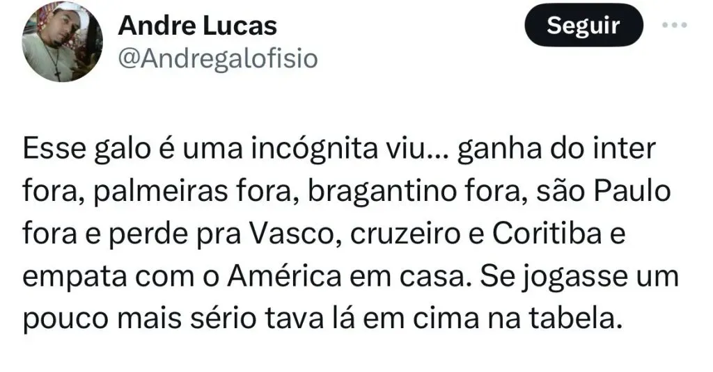 “Não tem muita explicação. A preparação é a mesma, os treinos são os mesmos. O jogo de domingo tinha um peso a mais por ser um clássico regional. Mas não teve falta de preparo, não teve menosprezo de nenhum dos jogadores”, disse o jogador.