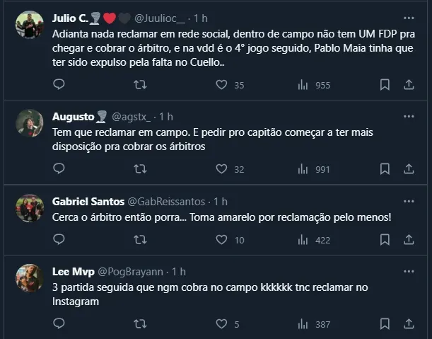 Já o meia Vitor Bueno foi mais sucinto e fez a seguinte postagem: “Terceiro jogo seguido e contando”. Vale frisar que o Furacão também se viu envolvido em polêmicas contra Palmeiras e Corinthians.
