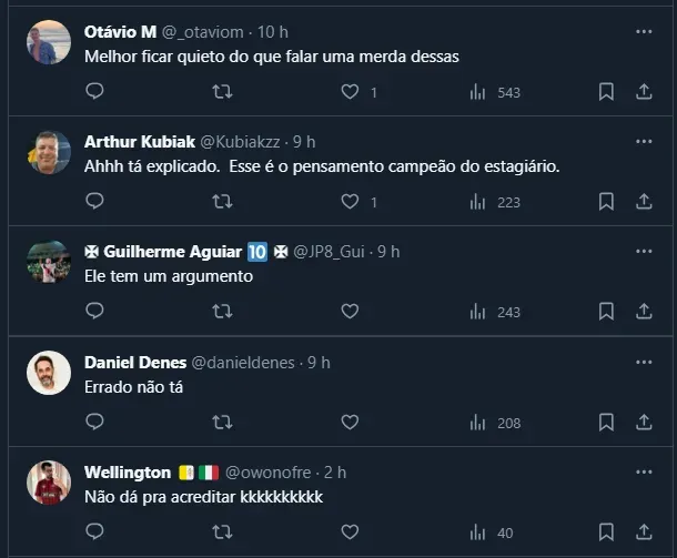 Dessa forma, por mais que seja uma constatação óbvia, o assunto não caiu bem na torcida do Furacão, que questionou muito a declaração do argentino, principalmente por demonstrar uma falta de incômodo pela situação atual.