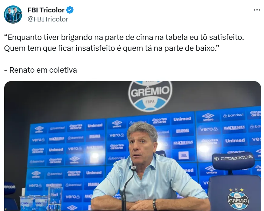 “Enquanto tiver brigando na parte de cima na tabela eu tô satisfeito. Quem tem que ficar insatisfeito é quem tá na parte de baixo”, alfinetou Renato, usando o já conhecido deboche em sua entrevista coletiva no CT do Grêmio.