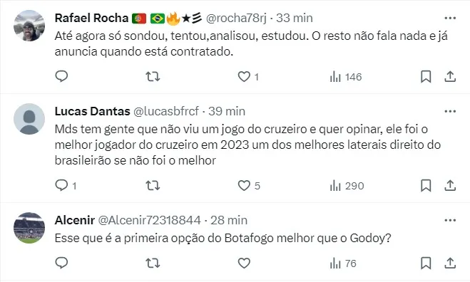 No entanto, ainda não é descartado uma nova investida pelo jogador de 28 anos, já que o Fogão busca um lateral-direito para a próxima temporada. Devido a lesões, William ficou duas temporadas sem jogar. Antes da chegada ao Cruzeiro, em janeiro de 2023, ele havia jogado pela última vez em 20 de março de 2021, quando ainda defendia as cores do Schalke 04, da Alemanha.