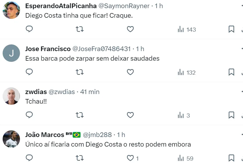 Diego Costa fez 15 jogos pelo Botafogo, com três gols marcados. Além da provável saída do veterano, outro jogador que não vai ficar no Glorioso é o atacante Erison, que jogou em 2023 pelo São Paulo.
