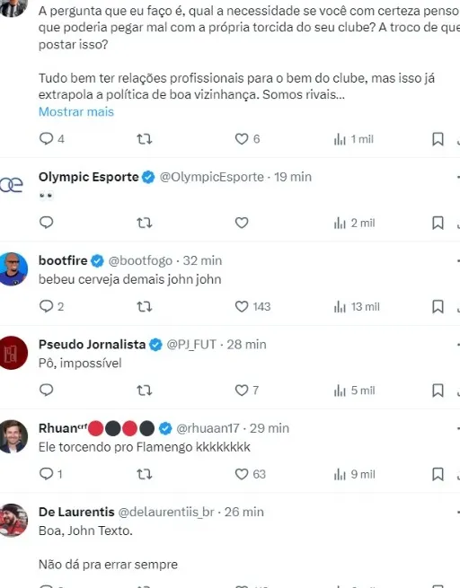 “Aguardando os lambe * do Textor vindo defender dizendo que ele é o próprio Jesus Cristo e salvou o Botafogo de ser explodido por uma bomba atômica” – “John textor torcendo pro Flamengo PODE DEMITIR ESSE CANALHA”, comentou outros dois torcedores.