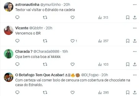 “Textor confirma que tem áudio de juiz, que não é de Série A, apita divisões inferiores, federação e polícia estão cientes, não remete a Botafogo e Palmeiras. É a gravação que no sábado afirmou ter em mãos”, finalizou Rizek.