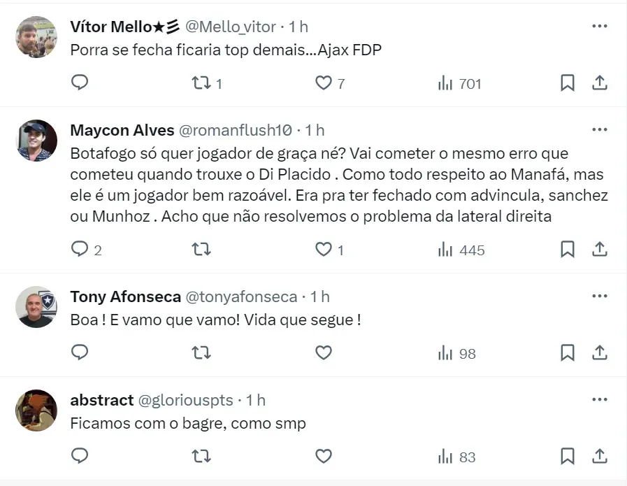 Em sua conta no X (antigo Twitter), o jornalista Medeiros informou que o Botafogo negociou a contratação do lateral-direito Jorge Sánchez, do Ajax, mas o time holandês mudou a condição do negócio na última hora.