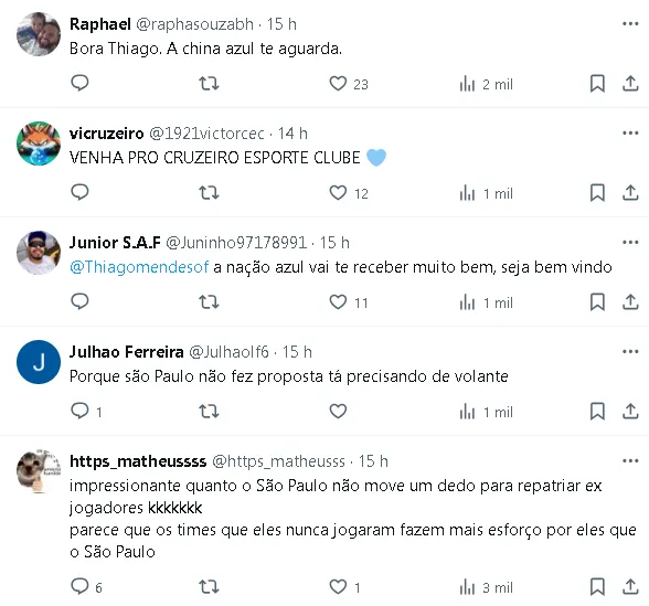 O meio-campista Thiago Mendes, atualmente no Al-Rayyan-QAT, revelou em entrevista ao jornalista André Hernan que ficou feliz com os pedidos da torcida do Cruzeiro para que ele se juntasse ao clube celeste. Apesar do entusiasmo dos torcedores, o volante mantém seu futuro em aberto e considera que ainda é cedo para definir seu próximo destino.