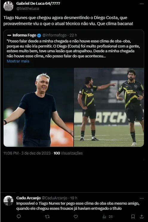 “Posso falar desde a minha chegada e não houve esse clima de oba-oba, porque eu não iria permitir. O Diego (Costa) foi muito profissional com a gente, esteve muito bem, teve uma lesão que atrapalhou. Desde a minha chegada não houve esse clima, não posso falar do que aconteceu antes. Conhecendo os profissionais que aqui estão, creio que não houve isso. Creio que faltou experiência. Hoje a gente cumpriu o 10º jogo sem vencer, mas não foi algo exclusivo do Botafogo. O Atlético-MG teve um momento igual, reverteu e chega com chances de título na última rodada”, disse Nunes.