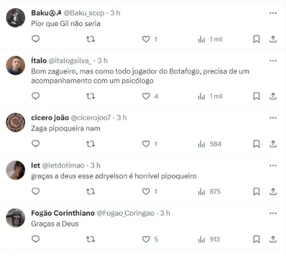 O jogador está próximo de se transferir para o Lyon, da França. O clube também faz parte da Eagle Football, de John Textor. Para substituir Adryelson, o Botafogo está de olho em João Victor, ex-Corinthians e que atualmente defende o Benfica, de Portugal.