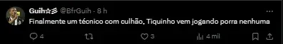 Para começar, o comandante expôs que o centroavante começou entre os reservas para ser poupado pela sequência de jogos. “Temos que avaliar tudo aquilo que é o momento, o contexto. Vínhamos de dois jogos muito exigentes do ponto de vista físico, queríamos poupar mais o Tiquinho nesse jogo”, revelou.