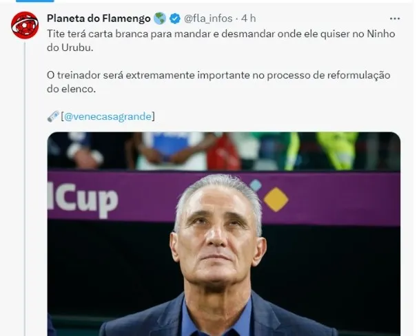 No início da tarde desta terça-feira (3), o GE confirmou que Tite disse sim ao Flamengo e aceita assumir o clube já em outubro. Contrato do treinador com o Rubro-Negro será até o fim de 2024. Técnico terá consigo trio de auxiliares e preparador físico que o acompanharam na seleção brasileira. Sua chegada pode afetar o Grêmio.