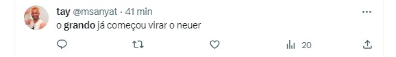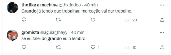 Houve ainda quem usou a ironia para falar que nunca criticou o gremista: “Se eu falei do Grando, eu não lembro”, brincou outro adepto do Imortal. Um torcedor lamentou a postura da equipe fora de caso, logo no início da partida: “Já começamos com milagre do Grando”, disse. Outro acabou indo exatamente na mesma linha: “Grando já tendo que trabalhar, marcação vai dar trabalho”, completou.