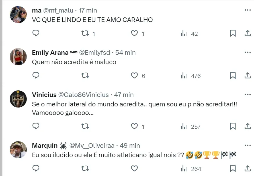 “Agora tem uma decisão quarta-feira (29) e eu acredito também”, disse Arana. O próximo jogo do Atlético-MG citado por Arana é contra o Flamengo, no Maracanã, em um confronto direto pelas primeiras colocações.