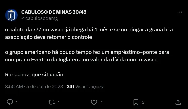 Entretanto, não é apenas a situação em campo que vem preocupando a diretoria do Cruz-Maltino. Isso porque, acabou nesta quinta-feira (5), o prazo para que a 777 Partners, mandatária do Vasco através da SAF, deposite o segundo aporte que é previsto em contrato. De acordo com informações do portal GE, até o momento o dinheiro não entrou na conta da SAF. Contratualmente o valor deveria ter caído em 5 de setembro, mas existe um período de carência de 30 dias.