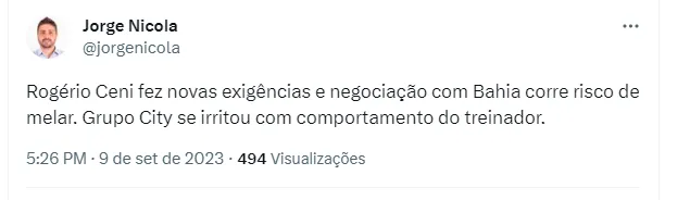 Isso porque o jornalista Jorge Nicola acabou revelando que o negócio pode melar. De acordo com o profissional, Ceni acabou fazendo novas exigências nos bastidores e isso pode fazer com que o Clube Baiano acabe desistindo do negócio e parta para um plano B. O Grupo City teria se irritado profundamente com o comportamento do comandante.