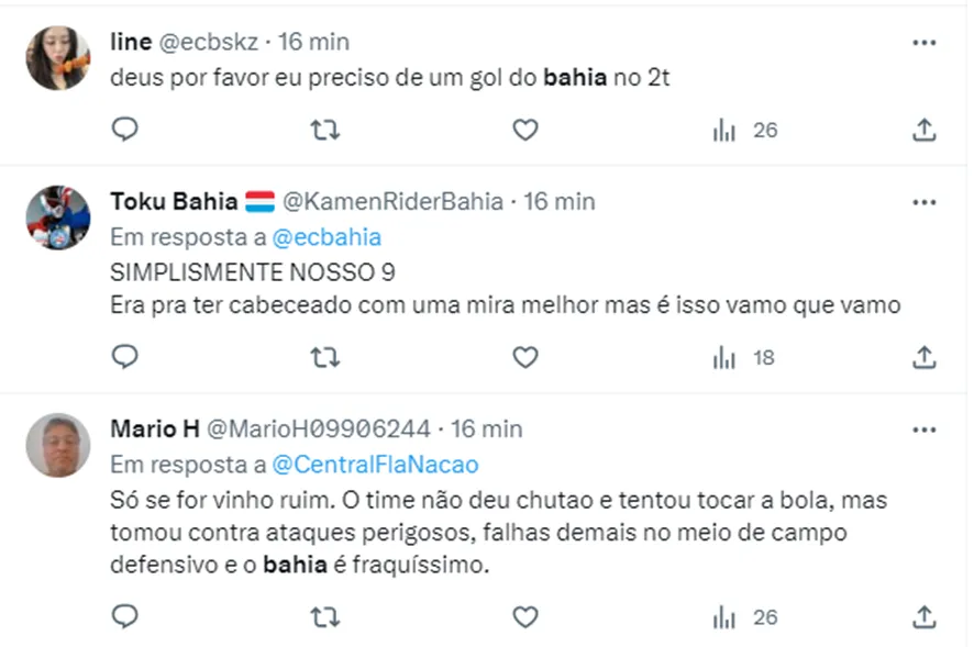 Nas redes sociais, os torcedores do tricolor baiano reclamaram e muito da ausência de uma referência, de um centroavante que impusesse respeito pra cima dos zagueiros do Mengão. Entre os principais questionamentos estão a falta de objetividade no ataque, a falta de saída de bola e a passividade que o Bahia vê o Flamengo jogar.
