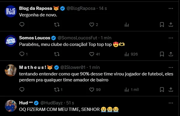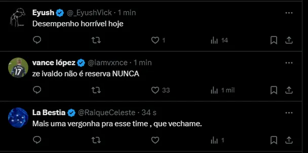 “Projeto Série B continua firme“, comentou o torcedor durante o 2° tempo. “Aparece Ronaldo, se pronuncia. Monta um time limitado, com um treinador fraco, e sequer se dá ao trabalho de explicar isso para a torcida“, disse um cruzeirense, pedindo mudanças e um posicionamento do Ronaldo.