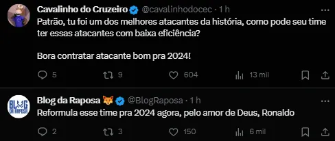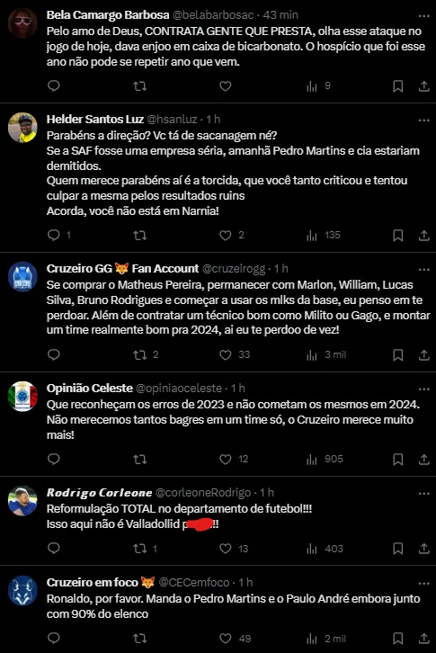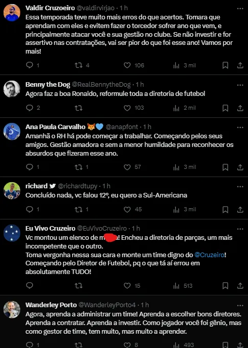 “Pelo amor de Deus, CONTRATA GENTE QUE PRESTA, olha esse ataque no jogo de hoje, dava enjoo em caixa de bicarbonato. O hospício que foi esse ano não pode se repetir ano que vem.”, desabafou um torcedor celeste na publicação de Ronaldo.