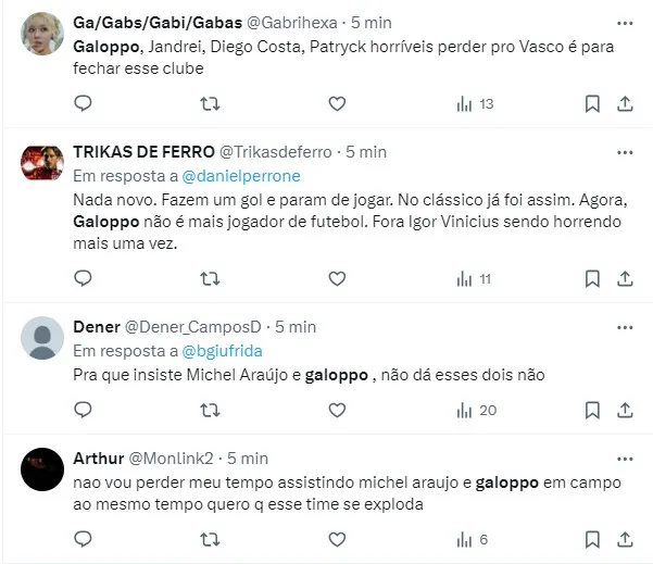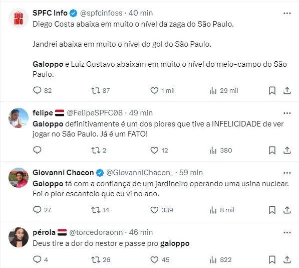 Por conta disso, gerou muitos comentários dizendo como Galoppo abaixa o nível do time tricolor, e muitos deles destacando o nervosismo do atleta quando pega a bola no pé.