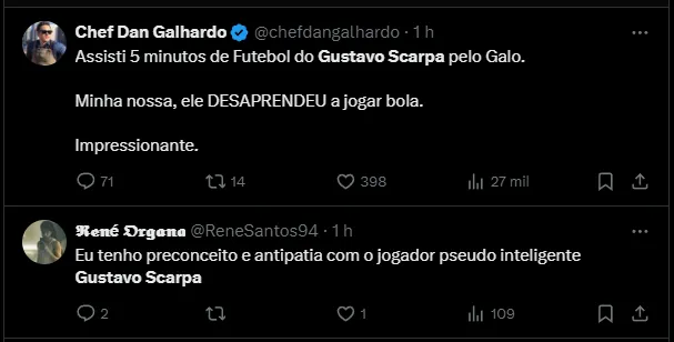 Assisti cinco minutos de futebol de Gustavo Scarpa pelo Galo. Minha nossa, ele desaprendeu a jogar bola, impressionante“, foi mais um dos comentários. Outro até foi em um tom humorado: “É incrível como ele não foi apresentado ao Galo“.
