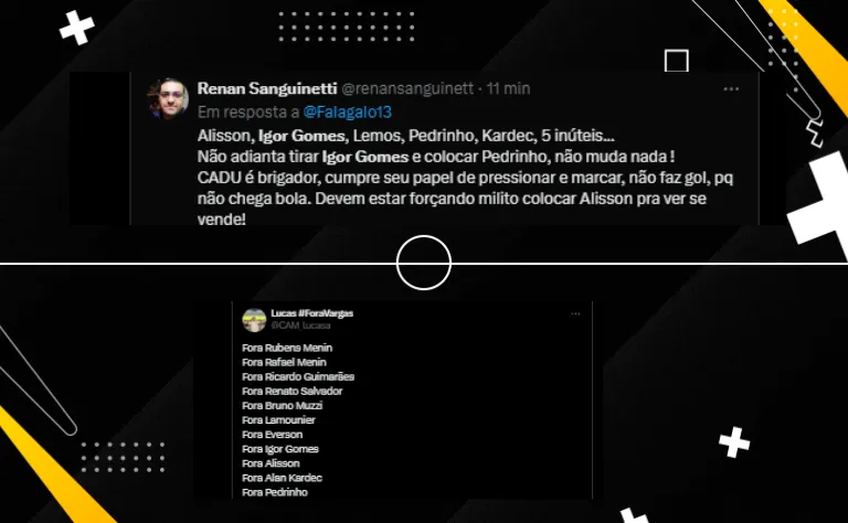 “Fora Everson. Fora Igor Gomes. Fora Alisson. Fora Alan Kardec. Fora Pedrinho”, publicou um torcedor reclamando do quinteto e pedindo que eles não façam mais parte da equipe a partir da próxima janela de transferências.