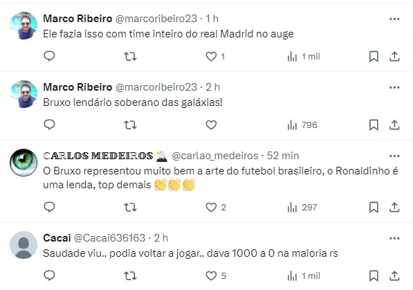 “Ronaldinho deu muitas alegrias para nosso glorioso Clube Atlético Mineiro! Salve!”, disse um outro torcedor do Galo. Outro lembrou os tempos do R10 no Barcelona: “Ele fazia isso com o time inteiro do Real Madrid no auge”, comentou.
