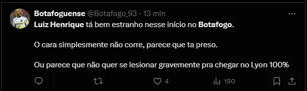 Um botafoguense perdeu a paciência com o atacante: “manda ele de volta para a Europa, por favor“. Outro comenta sobre a vontade do atleta em estar em campo: “o cara, claramente, está de sacanagem, não quer estar ali“.