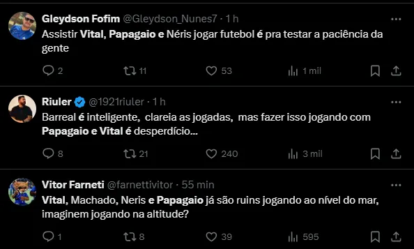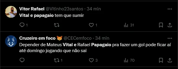 “Vital e Papagaio dois pesos mortos“, “A dupla Vital e Papagaio”, Depender de Mateus Vital e Rafael Papagaio pra fazer um gol pode ficar aí até domingo jogando que não sai” e “Assistir Vital, Papagaio e Néris jogar futebol é pra testar a paciência da gente“, foram alguns comentários.