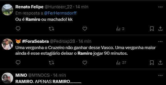 “Uma vergonha maior ainda é esse estagiário deixar o Ramiro jogar 90 minutos”, “Ramiro é muito fraco”, “Ramiro é ardido de ruim viu” e “Quarta feira a torcida tem vaiar o Ramiro os 90 minutos”, foram alguns comentários.
