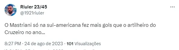 Outros torcedores do Cruzeiro também se renderam ao medalhão estrangeiro que joga no Coelho. “O Mastriani só na Sul-Americana fez mais gols que o artilheiro do Cruzeiro no ano…”. “Esse Mastriani joga muito, Cruzeiro podia buscar”.
