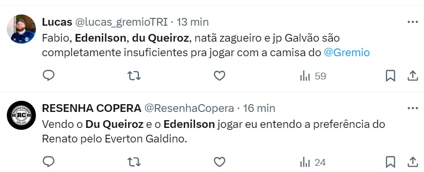 Jogadores importantes como Soteldo e Franco Cristaldo iniciaram no banco e, com isso, o treinador gremista colocou em campo Edenílson e Du Queiroz. No entanto, a dupla não foi bem e recebeu críticas na web.