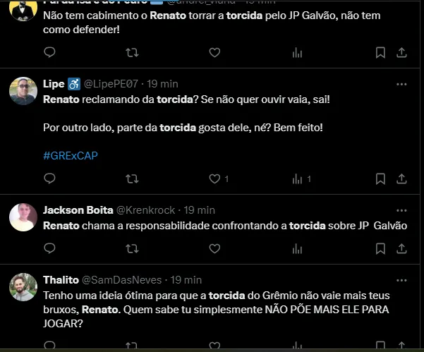 “Renato xingando a torcida? ele ta pirando mesmo né”, “Não tem cabimento o Renato torrar a torcida pelo JP Galvão, não tem como defender”, “Renato reclamando da torcida? Se não quer ouvir vaia, sai” e Renato brabo com a torcida vaiar o JP Galvão kkkko,tá de brincadeira”, foram alguns comentários.