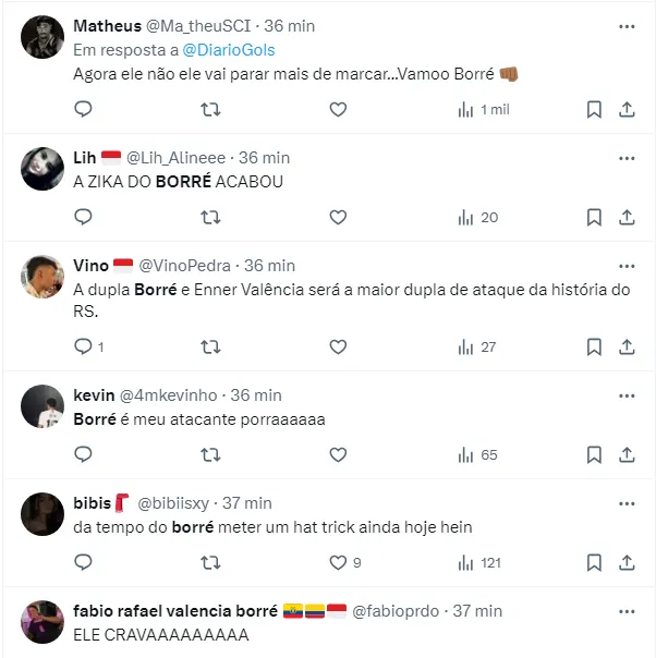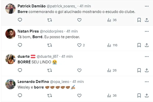 Borré comemorou mostrando o escudo do Inter, o que foi considerado também pelos torcedores colorados um sinal de “pertencimento” pela camisa. Veja as reações ao gol: