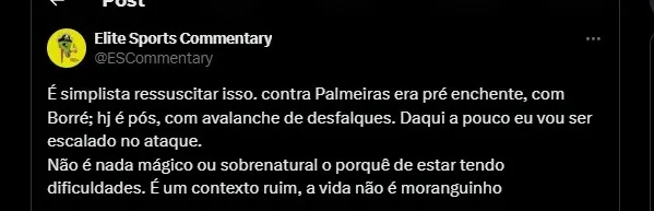 “É simplista ressuscitar isso. contra Palmeiras era pré enchente, com Borré; hj é pois, com avalanche de desfalques. Daqui a pouco eu vou ser escalado no ataque.