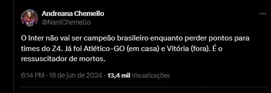 O Inter não vai ser campeão brasileiro enquanto perder pontos para times do Z4. Já foi Atlético-GO (em casa) e Vitória (fora). É o ressuscitador de mortos.