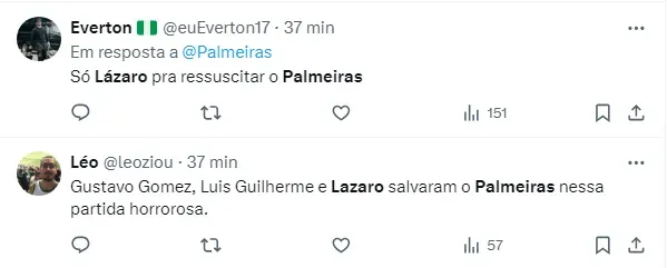 Veja as comemorações dos torcedores palmeirenses após o gol da vitória de Lázaro, com muitos deles considerando o atacante, ao lado do zagueiro paraguaio, um dos melhores em campo neste domingo.