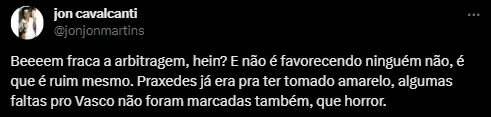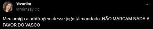 Caos no primeiro tempo para o Vasco. A torcida na arquibancada e, também, na web, está enfurecida com o andar do jogo. Dentre vários momentos péssimos que estão ocorrendo envolvendo os árbitros, os torcedores vascaínos estão dizendo que o São Paulo está nitidamente sendo favorecido.