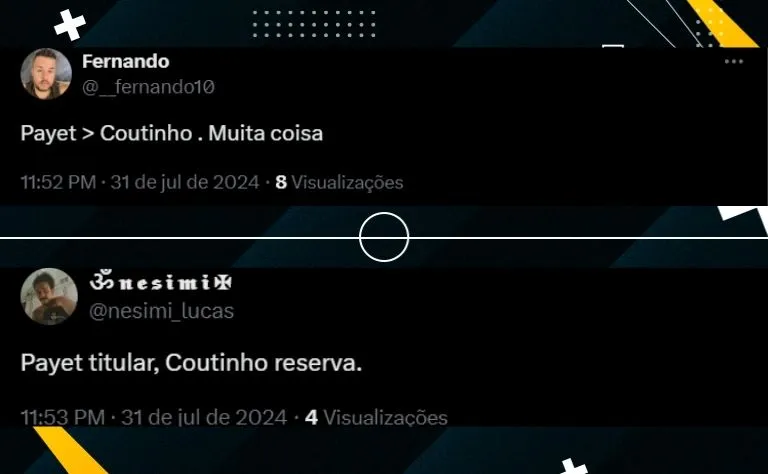 “Eu acho que o Payet tem mais a manha e o timing do jogo aqui no Brasil, sabia? Ele consegue jogar melhor de armador que o Coutinho. O Coutinho conduz bem demais a bola, mas o futebol brasileiro é muito mais de quebrar linha no pique do que na condução”, escreveu um torcedor no X, antigo Twitter.