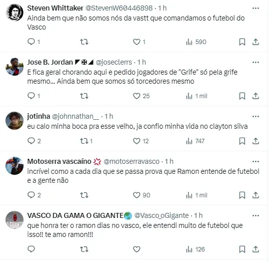 Isso foi o suficiente para muitos vascaínos se manifestarem no X, antigo Twitter, e opinarem sobre o comandante argentino. Segundo alguns, ele sempre teve razão e agiu bem ao não aconselhar o Time da Virada ir atrás do meia.
