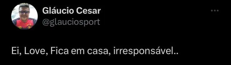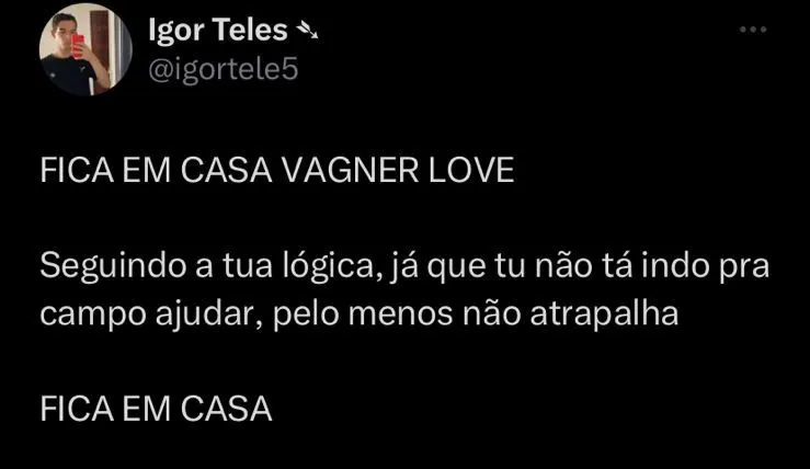 “FICA EM CASA VAGNER LOVE. Seguindo a tua lógica, já que tu não tá indo pra campo ajudar, pelo menos não atrapalha. FICA EM CASA”, disse um dos torcedores nas redes sociais. Se não fosse pelo pênalti perdido, o Sport teria vencido a partida e conquistado três pontos importantes nessa reta final da Série B do Campeonato Brasileiro.