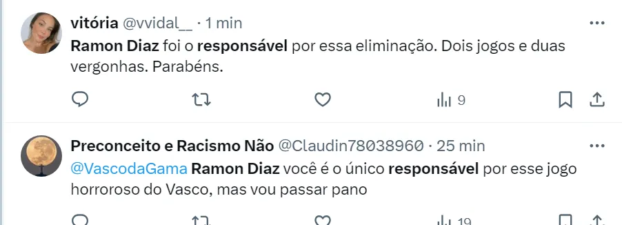 Matheus Giuberti, que cobre o dia a dia do Cruz-Maltino, escreveu no X (antigo Twitter) que o time do Vasco é muito melhor que o adversário de hoje e colocou a desclassificação na conta de Ramón Díaz.