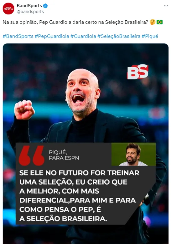 Para o ex-jogador, que fez história no clube blaugrana, a melhor opção para o futuro do técnico é bem evidente. “Se ele no futuro for treinar uma seleção, eu creio que a melhor, com mais diferencial, para mim e para como pensa o Pep, é a seleção brasileira”, comentou Piqué.