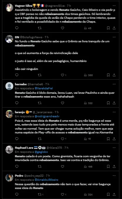 Em sua participação no programa Boleiragem, o treinador gremista Renato Gaúcho falou sobre uma ideia para evitar um desequilíbrio no torneio. “Eu não sou nem contra nem a favor (que Grêmio, Internacional e Juventude não sejam rebaixados), porque entendo que outros clubes da segunda divisão estão brigando para subir. Mas aí cabe à CBF arrumar uma solução. Então sobem os quatro e não cai ninguém”, começou.